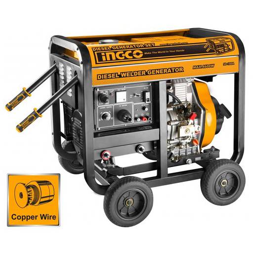 This robust Diesel Welder Generator offers a maximum output of 4.6KW with a 9.0HP diesel engine and 418ml displacement. It runs on a single phase at 220-240V and 50Hz, operating at 3000rpm. The generator features an air-cooled system, recoil and electric starting, and a copper coil alternator for efficiency. Equipped with a 15L fuel tank and a 30AH maintenance-free battery, it supports welding currents from 50 to 180A with electrodes sized 1.6-4mm. Insulation class F ensures durability. Packed securely in a carton box.