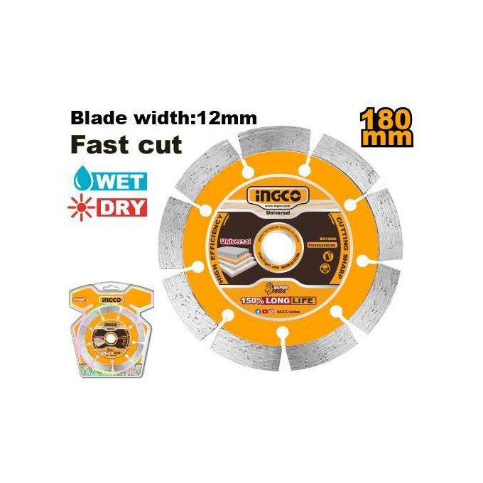 The Ingco Dry Diamond Disc DMD0118013 is a 180mm (7") cutting disc with a 22.2mm arbor and a robust 12mm blade width. Designed for efficient dry cutting, it ensures precision and durability. Comes packed in a double blister for added protectio