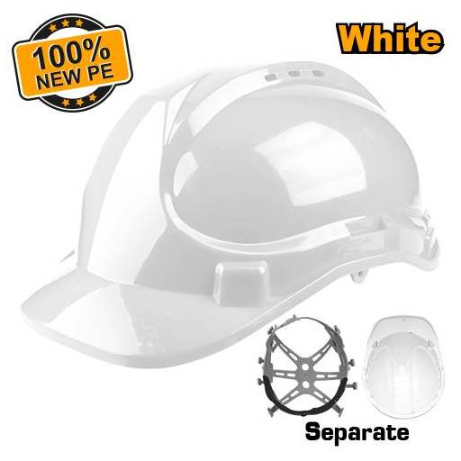 This Ingco Safety Helmet features a durable PE shell with ventilation for comfort. It includes a plastic lining material and an adjustable 8-point suspension system to fit various head sizes via a buckle. The helmet comes with a chin strap for sec