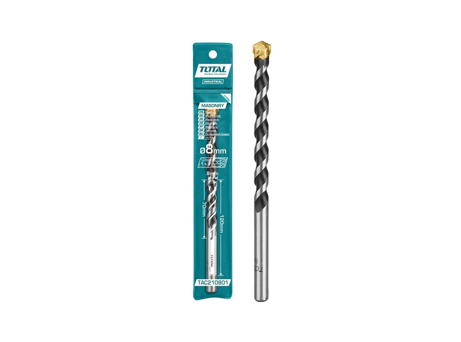 This Total Masonry Drill Bit measures 8x120mm and is designed for efficient drilling in masonry materials. It is conveniently packed in a plastic bag for easy storage and handling.