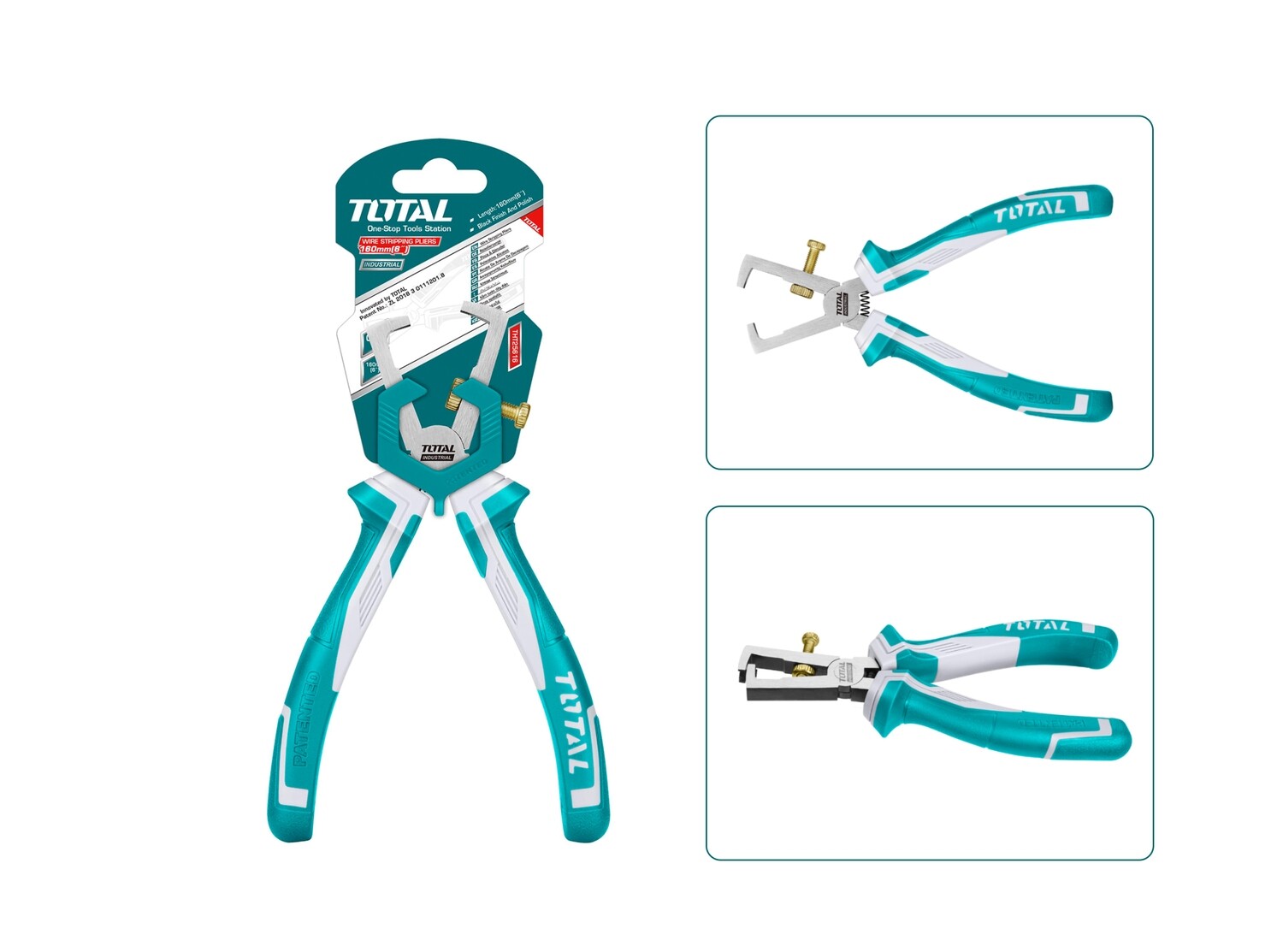 These Total Wire Stripping Pliers measure 6" (160mm) and are made from Cr-V steel with a black finish and polish for durability. They feature a two-color handle for comfortable grip and are packed with a PP hanger for convenient storage.