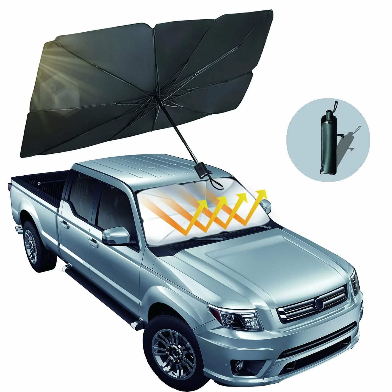 Portable auto parasol: reflective silver, opens like umbrella. Fits most cars/SUVs. Reduces cabin temp 30°C+, protects dash/upholstery. Folds to 40cm, storage pouch. Anti-UV, glare-free. Easy 10-sec setup. All vehicles. Available in Accra.