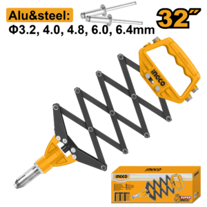 Heavy-duty riveter, size 815mm (32"), compatible with 3.2/4/4.8/6/6.4mm rivets. Delivers robust pulling force for fastening sheet metal, gutters, or frames. Supplied in color box, made for professional installers and fabricators.