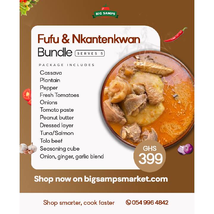 Enjoy the comforting taste of home with our Fufu and Nkatenkwan Bundle, carefully assembled to serve five. This package features cassava and plantain for smooth, soft fufu paired with a rich groundnut (peanut) soup. It includes premium peanut butter, fresh tomatoes, pepper, onions, and tomato paste to form a flavorful base. The protein selection boasts dressed layer chicken, smoked tuna or salmon, and savory tolo beefi. With added seasoning cubes and a blend of onion, ginger, and garlic, this bundle delivers a wholesome, traditional Ghanaian meal that's both delicious and convenient.