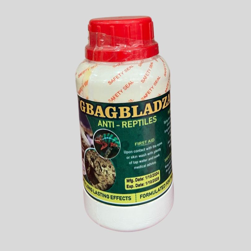 Gbagbladza Anti-Reptiles is a specialized reptile repellent designed to deter snakes, lizards, geckos, and frogs from entering homes, farms, and agricultural areas. Ideal for use in Ghana, this liquid concentrate forms an olfactory barrier that ir