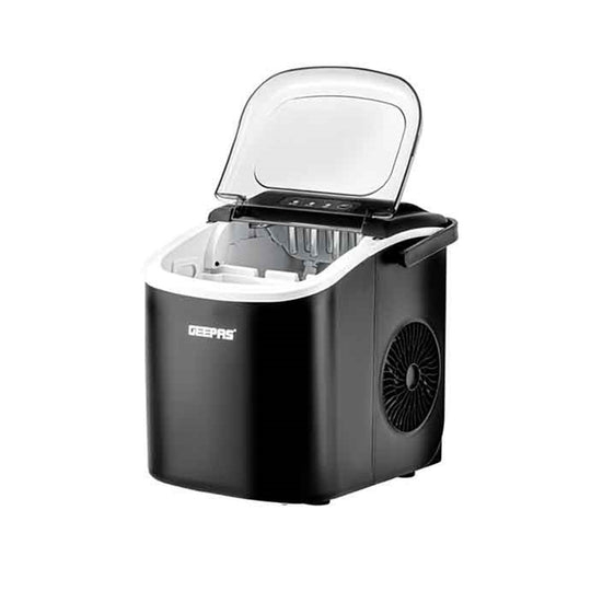 Make ice cubes at home with this compact Geepas ice maker. Produces 9 bullets/cycle (12kg/24hrs); ready in 7–15 min. 1.2L water tank; 0.6kg ice basket (removable). Auto shut-off (full/empty); drain plug. Compressor with eco gas; includes scoop/shovel. Dimensions: 25 x 35 x 33 cm; weight: ~9kg. AC 220–240V 50Hz. Perfect for parties or drinks. In stock in Accra – collect today!
