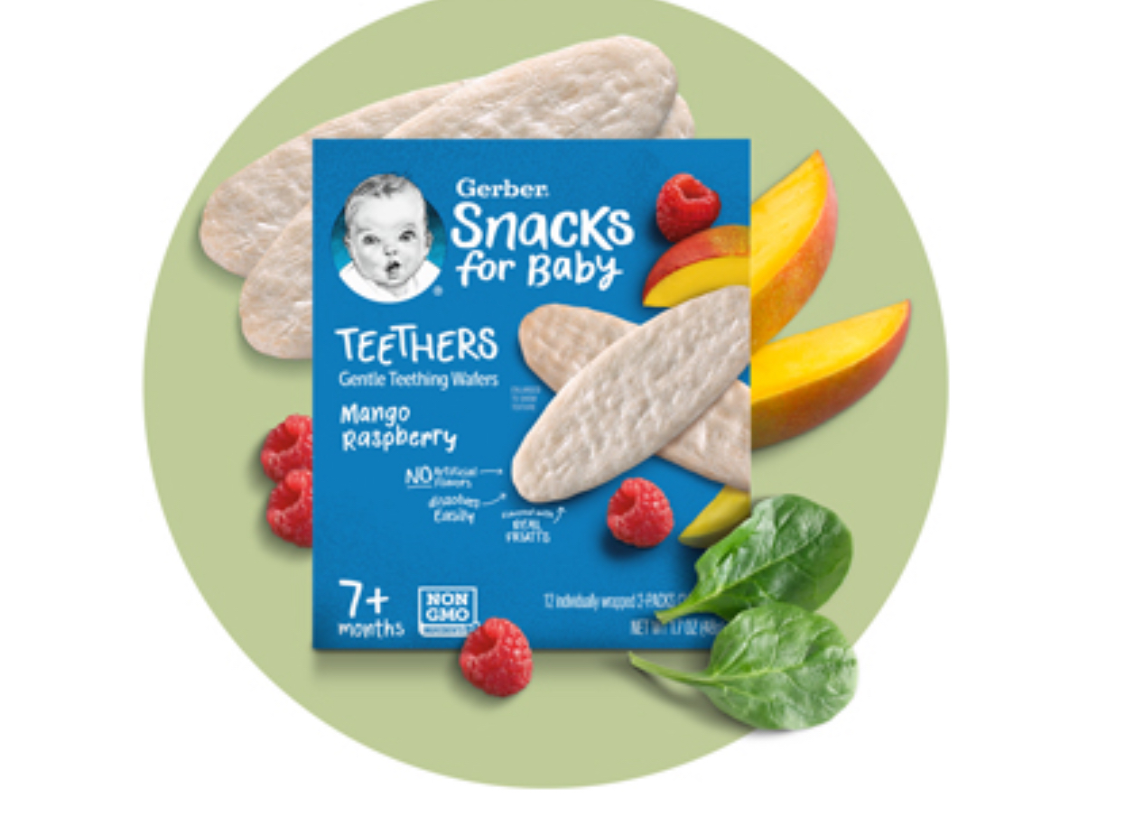 Soothe your baby's sore gums with Gerber Gentle Teething Wafers - a delicious and dissolvable snack specially designed for teething babies. These melt-in-mouth wafers combine the sweet taste of strawberry and apple with the added nutrition of