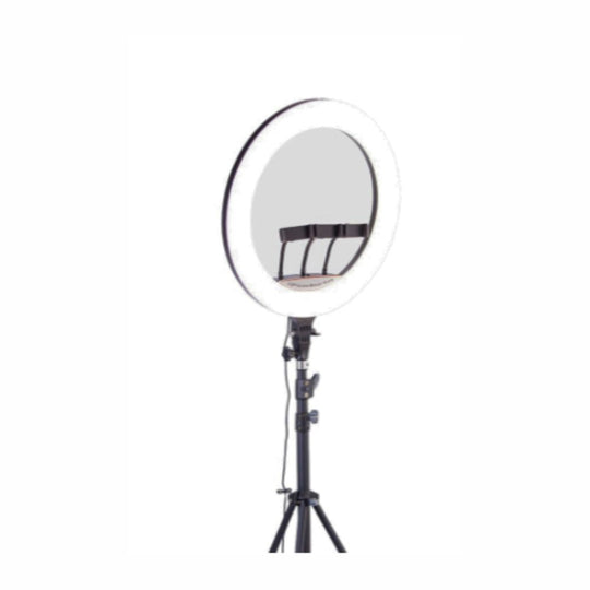 Professional ring light with 480 LEDs and stepless dimming from 2700K to 7000K. Includes adjustable tripod, 360° rotation, remote control, and phone holder. Made from ABS + PP. Suitable for streaming, vlogging, and photography.