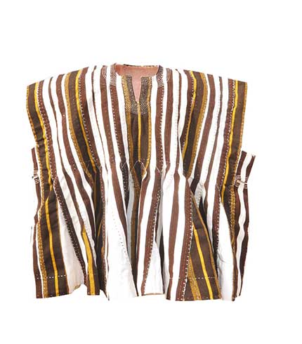 Experience the pinnacle of Fugu craftsmanship with 'The Ultimate' smock in coffee, gold, and white. This 100% handmade garment is a true masterpiece, featuring a luxurious color palette that exudes opulence. Woven from the finest cotton, it is the perfect attire for the most significant events, such as a wedding ceremony or a chief's installation, offering unmatched elegance.