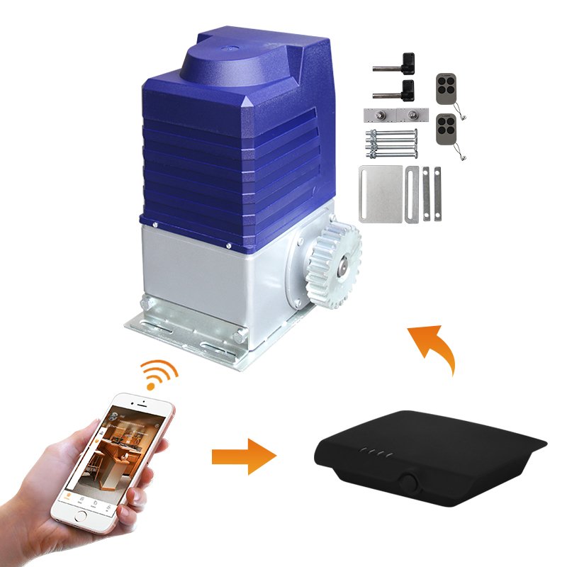 Commercial rack/pinion motor: 550W, 3–5m/min speed, soft start/stop. Limit switches, auto-reverse, manual release. Remote (433MHz, 4 buttons), photocells, flashing lamp. Weatherproof IP44. Steel gear, 1-year warranty. Installation kit. Fast delivery in Accra.