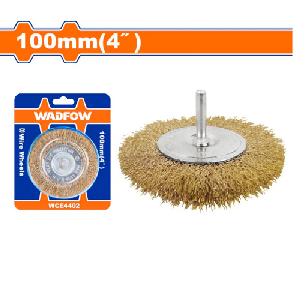 The WCE4402 is a 100mm (4") diameter wire wheel designed for versatile surface preparation tasks such as deburring, descaling, paint stripping, and weld seam cleaning. It features a 1/4" shank diameter for quick attachment to drills and ro