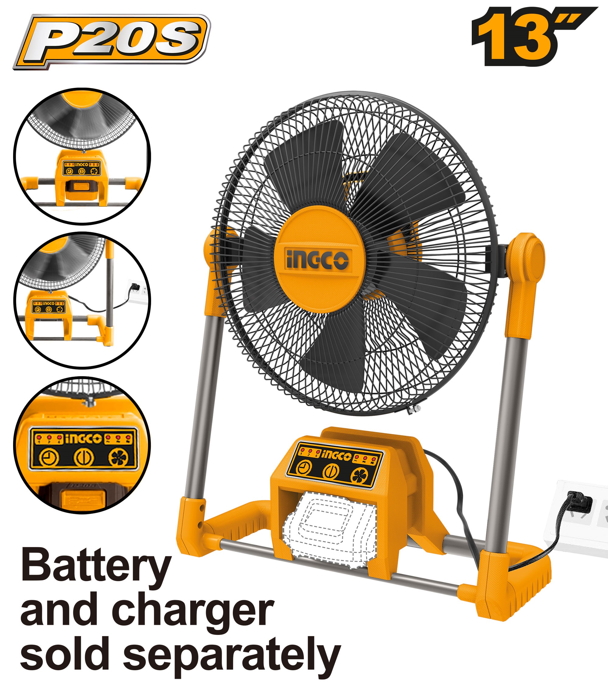 The CFALI2001 is a versatile and portable 13-inch cordless fan from Ingco, designed to deliver cooling comfort both indoors and outdoors. Part of Ingco's 20V lithium-ion platform, this fan operates on DC 20V battery power for cordless mobility, wh
