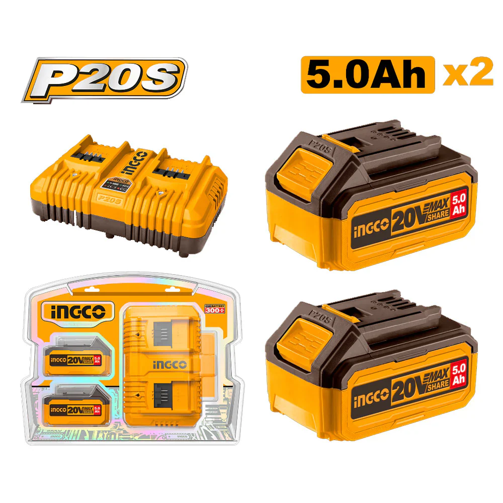 The FBCPK2425 is a high-capacity power solution from Ingco, comprising two 20V 5.0Ah lithium-ion battery packs and a compatible fast charger, designed to keep your cordless tools running longer and stronger. Ideal for professionals and heavy-duty