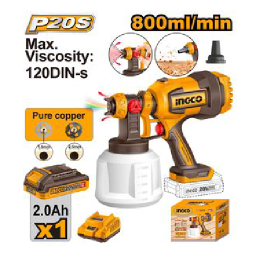 The INGCO 20V Cordless Spray Gun (CSGLI20042) is a highly efficient and portable tool designed for painting and coating tasks across various surfaces. Operating on the INGCO 20V lithium-ion platform, this spray gun delivers a maximum flow rate of