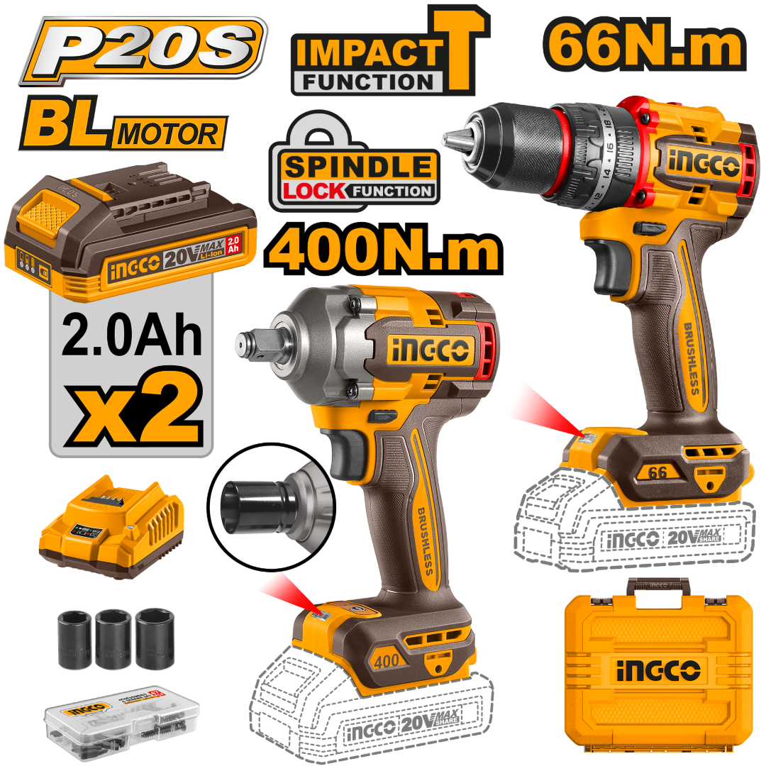 The INGCO CKLI20275 2-piece cordless combo kit offers a powerful and efficient solution for a wide range of drilling, driving, and wrenching tasks. Powered by the INGCO 20V P20S lithium-ion platform, this kit includes a compact brushless impact dr
