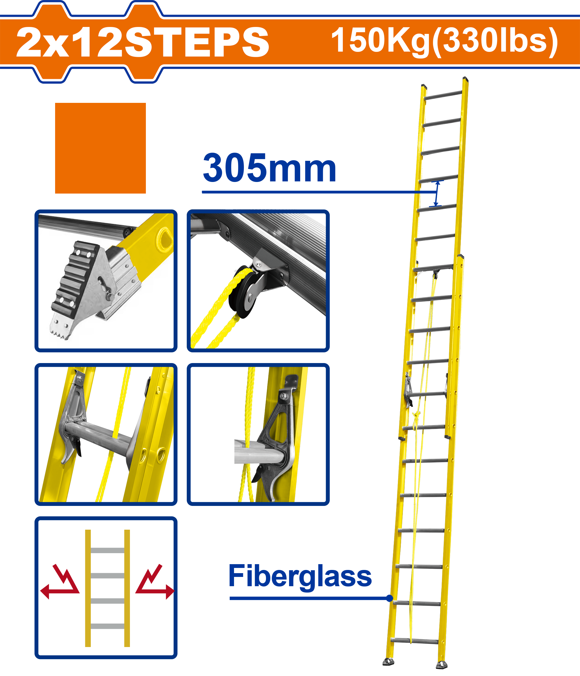 The Wadfow WLD0924 2×12 Step Extension Fiberglass Ladder is a high-performance, durable solution for reaching significant heights while ensuring safety, especially in environments with electrical hazards. Constructed from fiberglass, this ladder is non-conductive, making it ideal for electrical work, and offers great strength and weather resistance. The ladder features a two-section design with a total of 24 steps, reaching a maximum height of 6.7 meters. The step rise of 305 mm ensures a comfortable climb, while the maximum load capacity of 150 kg supports both the user and their tools. Despite its 18 kg weight, the ladder is stable and reliable, perfect for a variety of professional applications such as electrical maintenance, construction, painting, HVAC work, and general maintenance. The ladder's compact size when retracted makes it easy to store, while the poly bag packaging ensures it is protected during shipping. With its sturdy design and essential safety features, this ladder is an invaluable tool for any high-altitude task.