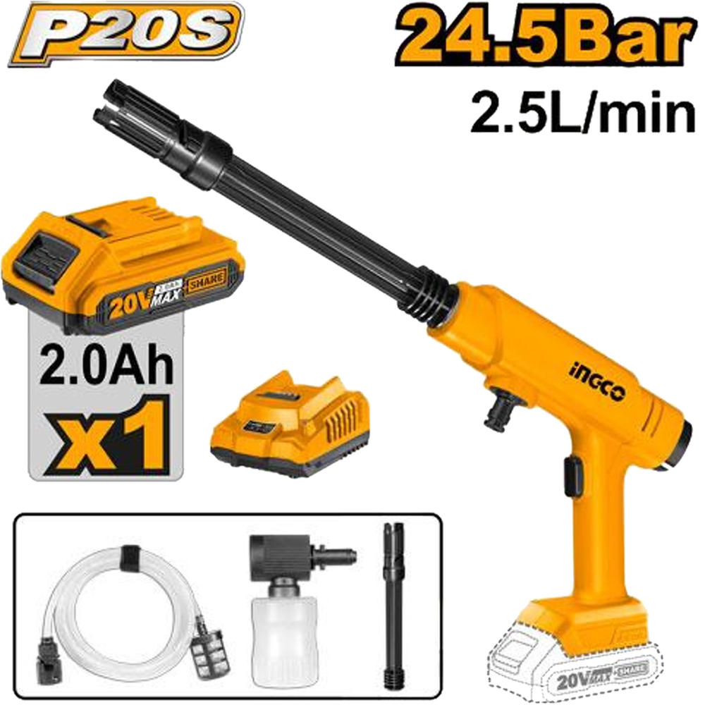 The INGCO 24.8 Bar Cordless Pressure Washer (CPWLI20362) is a compact, portable cleaning solution ideal for outdoor use where mobility and flexibility are key. Powered by a 20V lithium-ion battery, this washer delivers a maximum pressure of 24.8 bar with a flow rate of 2.8L/min, making it effective for washing cars, cleaning patios, garden tools, or outdoor furniture. It features an auto-stop system to conserve energy and water when not in use, and includes a 2-pattern spray gun, 6-meter water inlet hose with quick connector, 300ml foam producer, self-suction connector, and a convenient carry bag for portability. The unit also comes with a 2.0Ah battery pack and charger, offering cordless convenience without sacrificing performance. With its self-priming ability and soap application functionality, this pressure washer is a versatile, eco-friendly, and user-friendly tool for all your light to moderate cleaning needs.