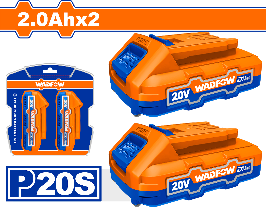 The WOS240682 is a set of two 20V lithium-ion battery packs (WLBP520), each with a 2.0Ah capacity, tailored for WADFOW's P20S cordless tool system. These compact and efficient batteries offer solid runtime for a wide range of tasks, and with two i