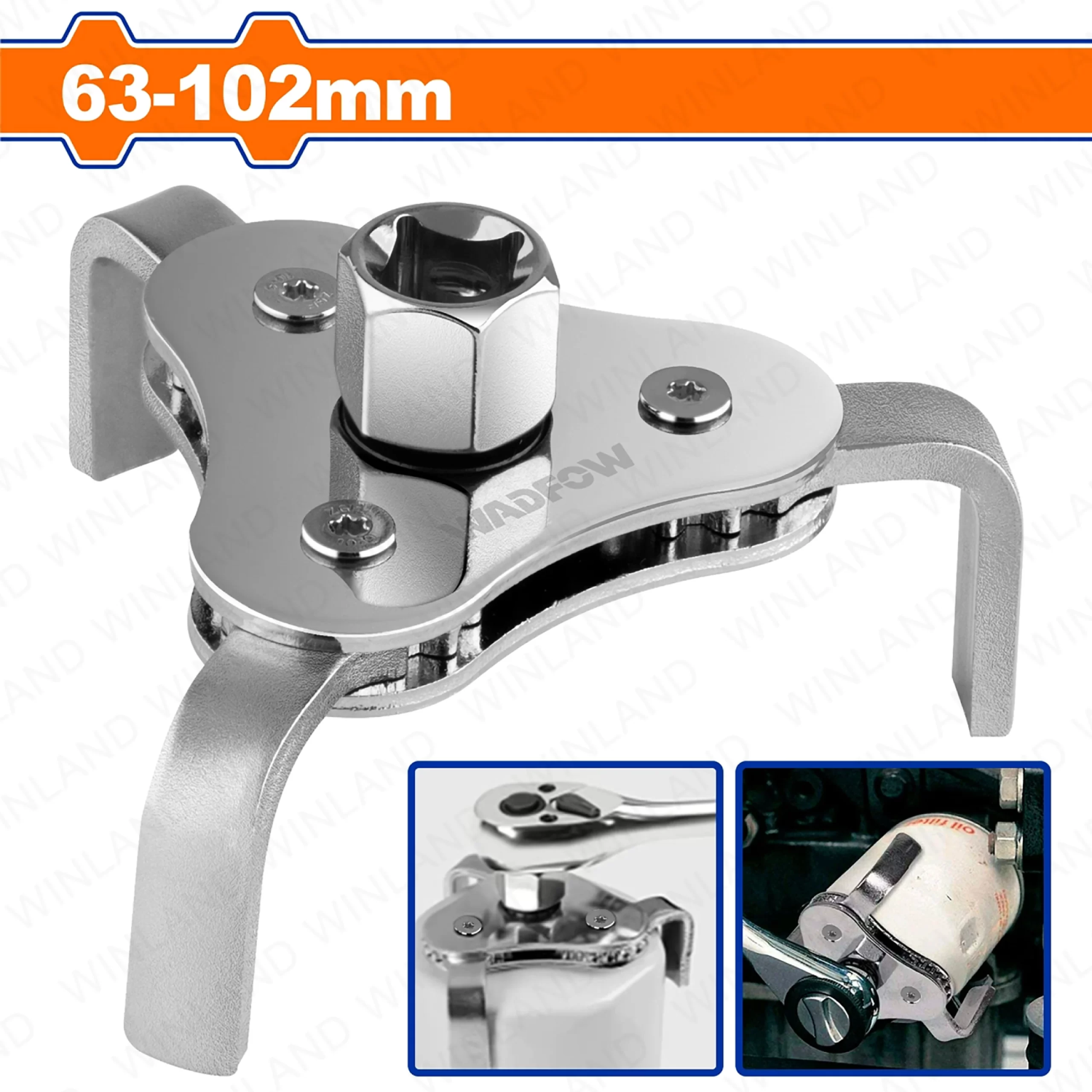 Its key feature is the automatic self-adjusting three-jaw mechanism, which securely grips oil filters ranging from 63mm to 102mm in diameter. Each claw is 40mm long, providing ample surface contact for a stable grip during removal or installation. This adaptable design accommodates a wide variety of oil filters used in cars, trucks, motorcycles, ATVs, and more.