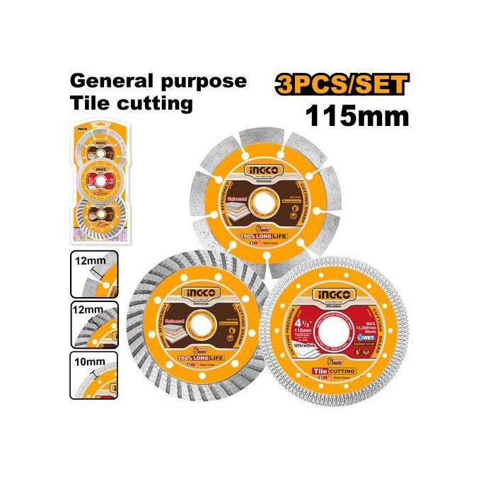 The INGCO DMD063115 3-Piece 4?" Dry Diamond Disc Set offers a versatile and efficient cutting solution for a variety of materials, making it an essential addition to any toolkit. This set includes three high-quality diamond discs, each designe