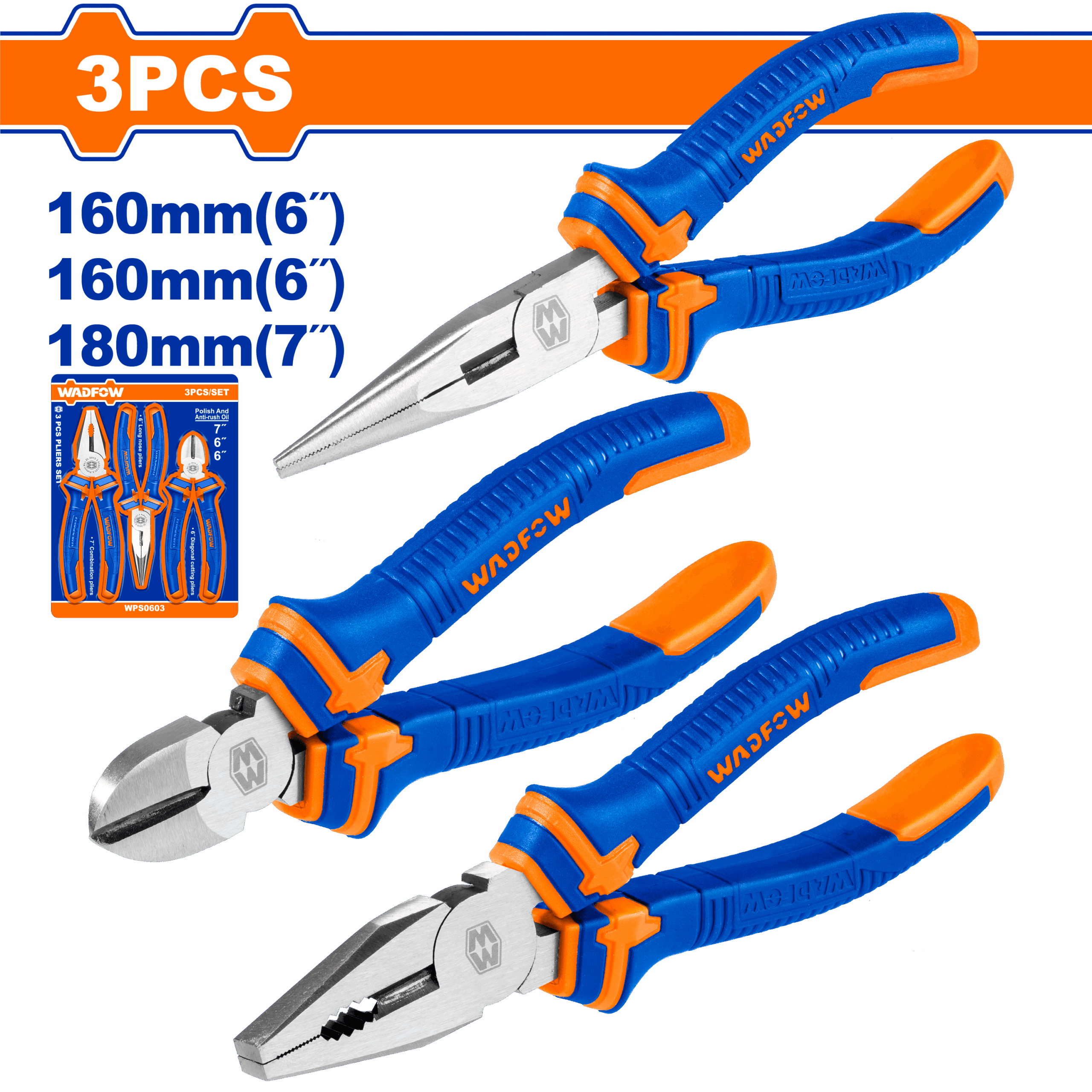 The WPS0603 is a 3-piece plier set tailored for general-purpose tasks in home improvement, electrical work, and mechanical repairs. It includes 7-inch combination pliers, 6-inch long nose pliers, and 6-inch diagonal cutting pliers–covering essential functions such as gripping, bending, and wire cutting. Each tool features a polished finish and is treated with anti-rust oil, enhancing its durability and resistance to corrosion. The two-color handles are ergonomically designed for comfort and a secure grip during extended use. This versatile set comes packed on a sliding card for convenient storage and retail presentation, making it a reliable addition to any toolbox.
