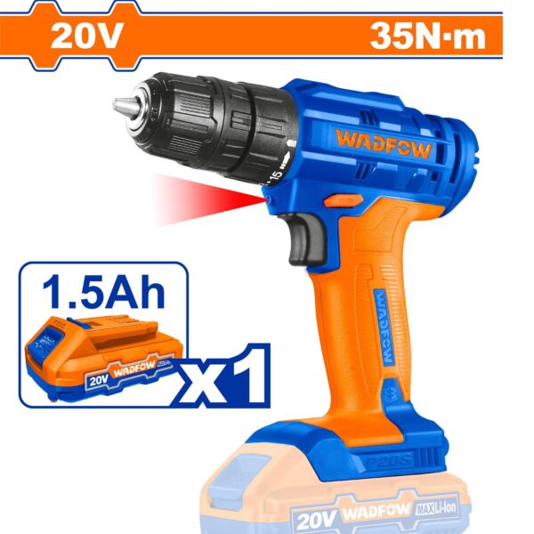 The Wadfow WCDP511 20V cordless drill is a reliable and versatile tool perfect for general drilling and screwdriving tasks. With a maximum torque of 35Nm, it provides sufficient power for a variety of DIY and light professional applications. The drill features a two-speed mechanical gear (0–400 rpm for high torque and 0–1500 rpm for fast drilling) and 15+1 torque settings for precise control when driving screws. The 0.8–10mm plastic chuck accommodates a wide range of bits, while the integrated LED work light ensures visibility in poorly lit areas. The WCDP511 includes a 1.5Ah battery and a charger (WFCP518), compatible with Ghana's power supply, offering convenience and uninterrupted work. Whether assembling furniture, drilling holes in wood, plastic, or light metal, or tackling household repairs, the WCDP511 is a practical and portable solution for your needs.