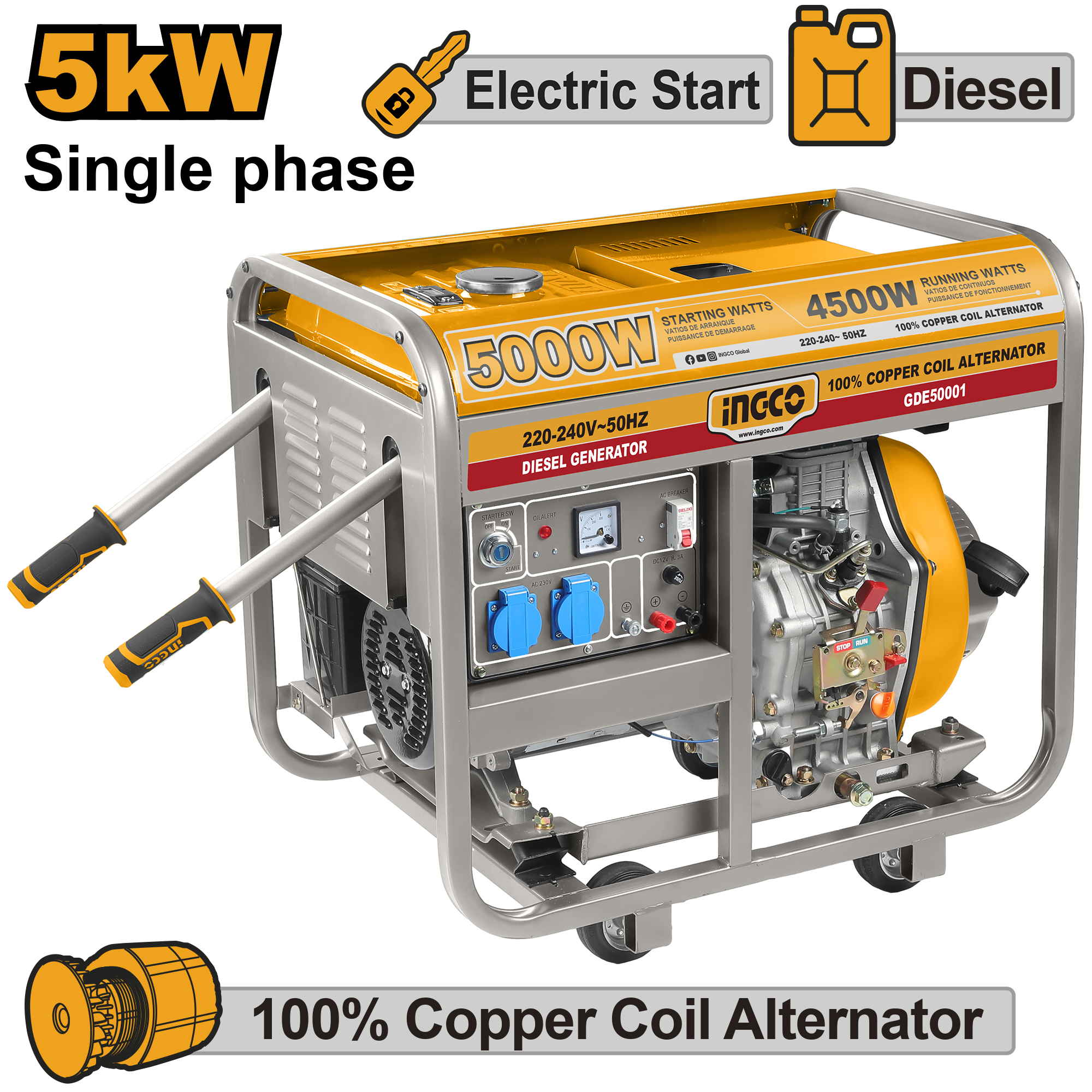 Starting is simplified with both electric and recoil options, ensuring convenience in different environments. The copper coil alternator provides efficient power generation, while the 12V DC output (8.3A) allows you to charge external batteries. With a 15-liter fuel tank, the GDE50001 offers extended runtime without frequent refueling.
