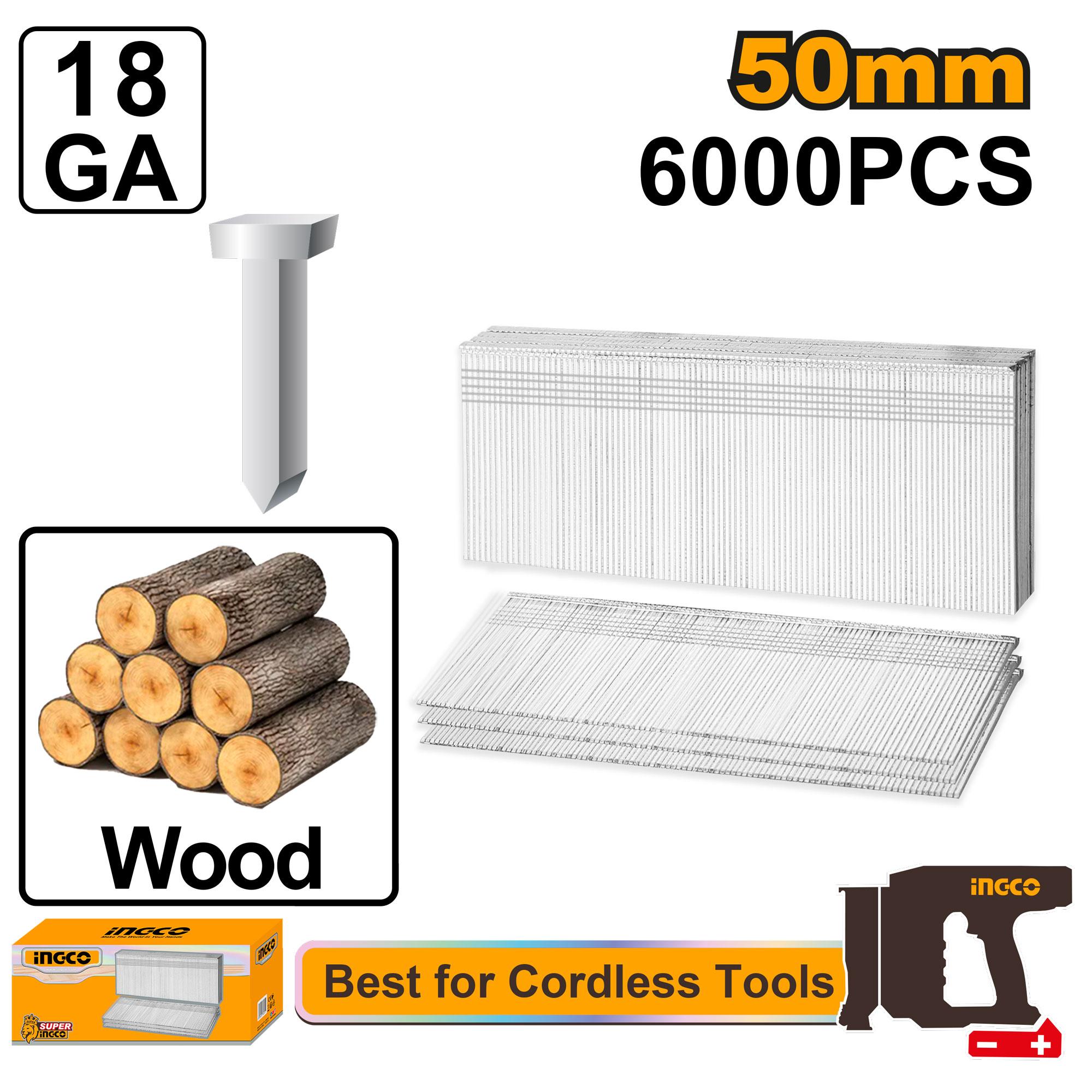 The INGCO 6000PCs 50mm Brad Nail Set (ANA18506) is designed for precise and secure fastening in woodworking, trim work, and other finish applications. These 18-gauge nails, measuring 50mm in length, are ideal for use with Ingco brad nailers (and o