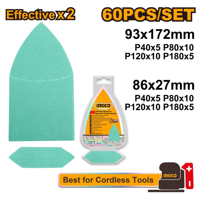 The INGCO 60PCS Sanding Sheet Set (AKTS938660) is a versatile collection designed for efficient sanding and surface preparation on a variety of materials. Featuring 60 sheets in two sizes—93x172mm and 86x27mm—with a mix of grits (P40, P80, P120, and P180), this set is suitable for tasks ranging from aggressive material removal to fine finishing. Compatible with various sanders, it performs well on wood, paint, plastic, metal, stone, wall surfaces, and glass. Packed in a convenient double blister for easy storage and access, it’s ideal for both DIY and professional use.