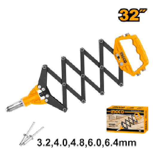 The riveter features a size of 815mm (32") and is compatible with a wide range of rivet sizes: 3.2mm, 4mm, 4.8mm, 6mm, and 6.4mm. This versatility makes it ideal for use in automotive, construction, and general repair projects, allowing users to quickly and securely fasten materials together.