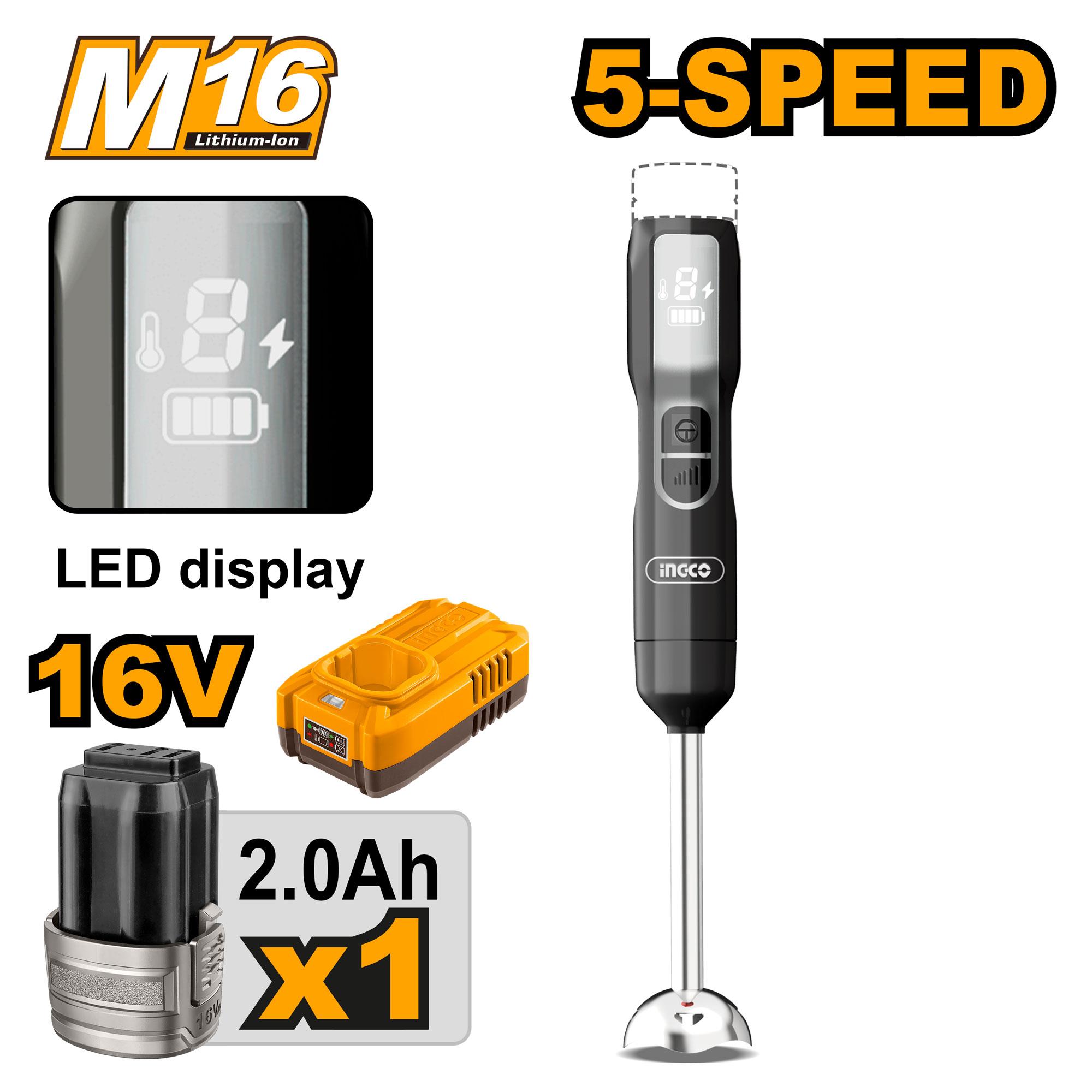 The Ingco 100W Cordless Hand Blender (16V) – CHB048K is a versatile and powerful kitchen tool designed to make blending tasks easier and more efficient. Powered by a 16V DC lithium-ion battery, this hand blender offers the freedom of cordless use, allowing you to blend soups, sauces, smoothies, and juices without being restricted by power cords. Equipped with a stainless steel SUS shaft blend rod and 2 stainless steel blades, it ensures smooth and consistent results every time. With a 5-speed control and an LED display, you can easily adjust the speed to suit different ingredients and tasks. The included 2.0Ah battery provides ample runtime, while the charger (FCLI1613) allows for convenient recharging. The CHB048K is compact and lightweight, making it easy to handle, and comes in a color box for protection and storage. Perfect for any kitchen, this hand blender combines convenience, power, and portability for all your blending needs.