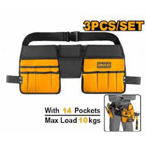 The set includes two pouches sized L26 x W23cm and one smaller pouch measuring L15 x W13cm, offering versatile storage for tools and accessories. An adjustable belt ranging from 92cm to 127cm ensures a comfortable and secure fit for users of different sizes.