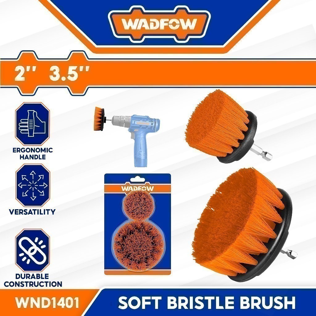 The Wadfow WND1401 2-piece Soft Bristle Brush Set is the ideal solution for gentle yet effective power cleaning of delicate surfaces. This set includes a 2-inch and a 3.5-inch soft bristle brush, both designed for use with a drill or impact driver