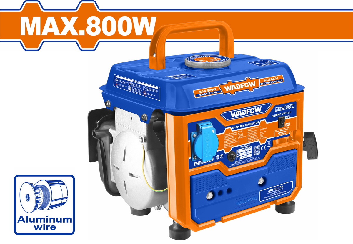 The WADFOW WGEAA01 is a compact and efficient gasoline generator designed to meet basic power needs. With a maximum output of 0.8kW (800W) and a rated output of 0.65kW (650W) or 0.75kW (750W), depending on the model variation, this generator is id