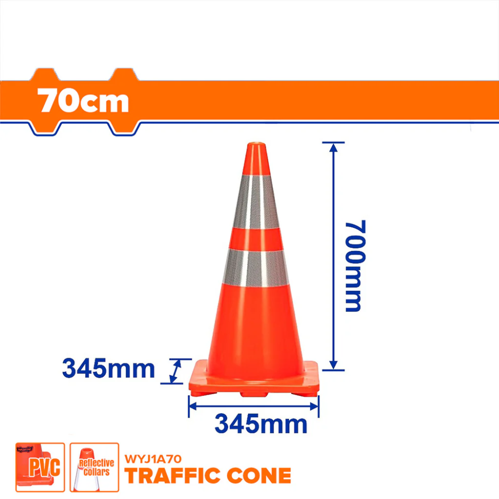 The Wadfow WYJ1-70 traffic cone is a 70 cm tall, high-visibility safety tool made from flexible, weather-resistant PVC that resists cracking and deformation upon impact. Its stable 34.5 cm x 34.5 cm square base minimizes tipping in windy or high-t