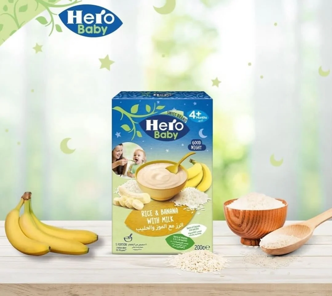 Introduce your baby to the gentle taste of rice and banana with Hero Baby's premium milk porridge. This Swiss-formulated cereal combines easily digestible hydrolyzed rice with real banana pieces and essential nutrients, creating the perfect tr