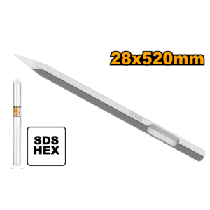 Extra-long 28x520mm pointed hex chisel, delivers powerful penetration in concrete or masonry. Designed for big demolition jobs or deep material removal. Comes with a plastic tube for secure storage and transport.