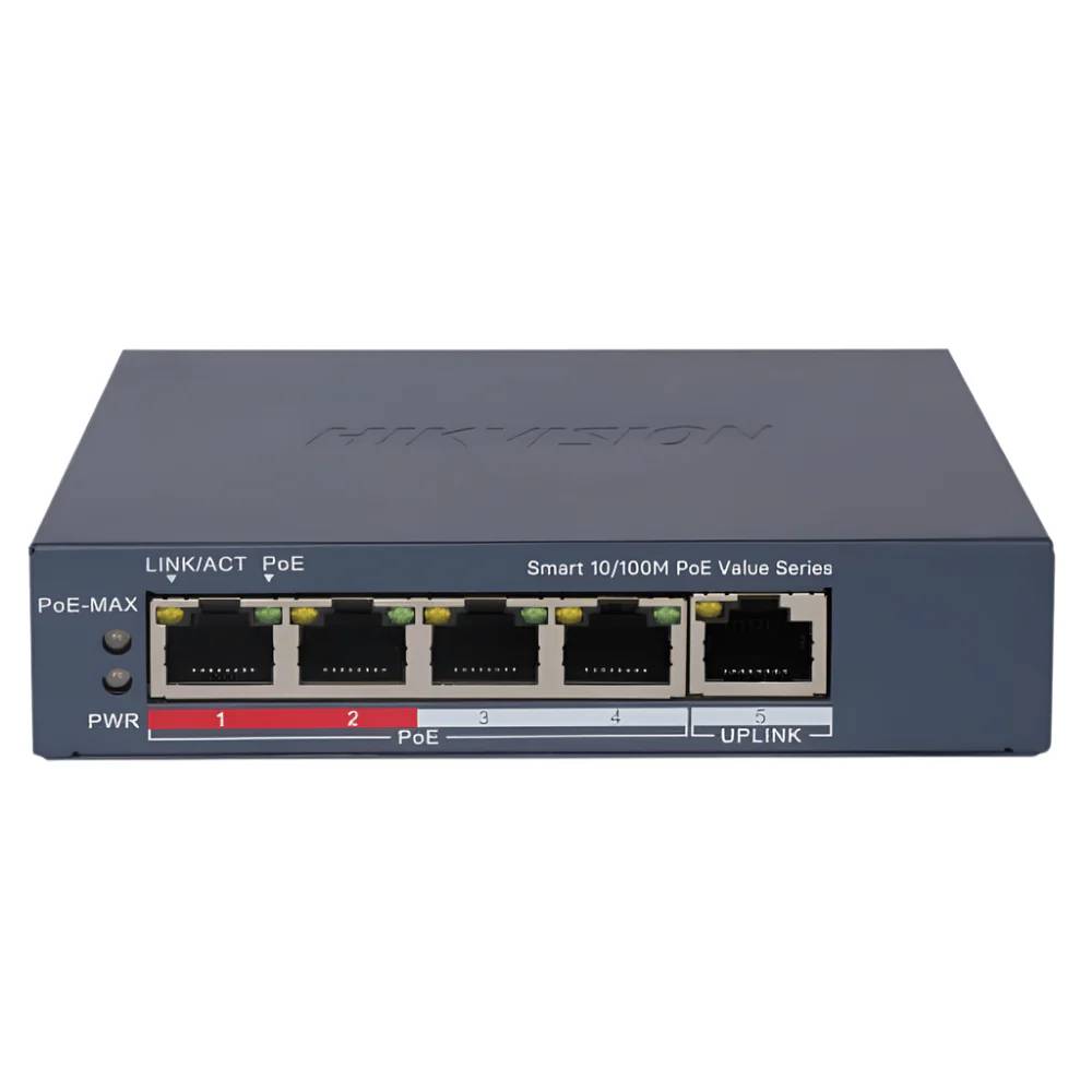 The Hikvision DS-3E1105P-EI/M is a 4-Port Fast Ethernet Smart PoE Switch built for security and network expansion. With a 45W PoE power budget, support for long-range 300m PoE transmission, surge protection, and auto recovery features like PoE watchdog, this smart switch ensures stable connectivity for PoE-enabled devices including IP cameras and access points.
