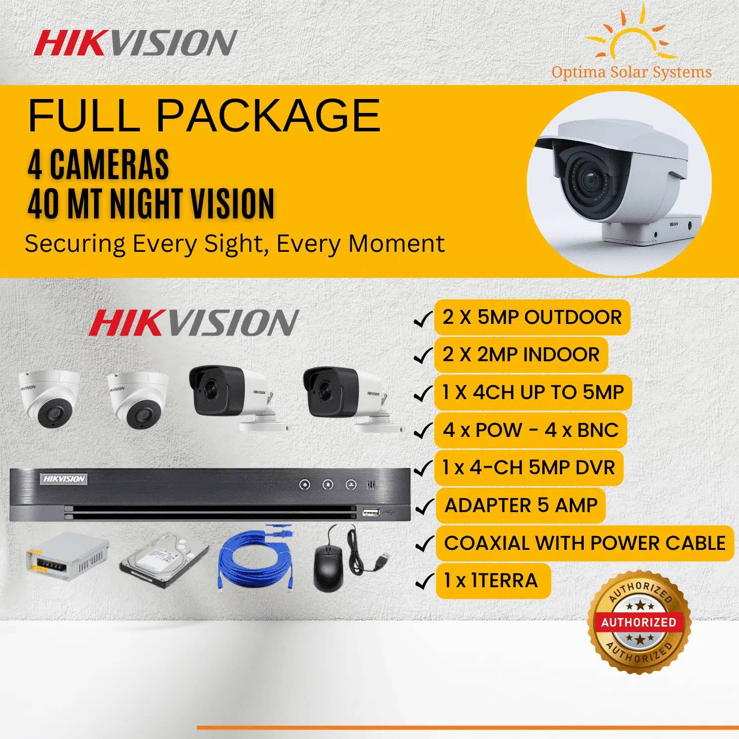 Secure your home or business with the Hikvision Security System – Full Package, a complete high-definition CCTV surveillance solution designed for round-the-clock protection. This all-in-one setup includes outdoor and indoor cameras, a 4-channel 5MP DVR, a 1TB surveillance hard drive, and all required accessories for an easy installation and reliable 24/7 video recording.