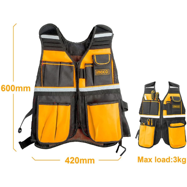 The Icobeg INGCO Tools Vest is a high-quality, adjustable safety vest designed for professionals who need convenience and comfort on the job. Made from breathable air mesh material, this vest ensures maximum ventilation during long work hours. It features adjustable shoulder straps and a customizable waist size for a secure and comfortable fit. With a maximum load capacity of 3kg and multiple storage compartments, including 7 pockets, it provides ample space to organize and carry tools efficiently. Whether you're on a construction site or in a workshop, this vest offers durability and functionality. Available in XXL size and a stylish black/yellow design, it's a must-have for anyone needing reliable tool storage.