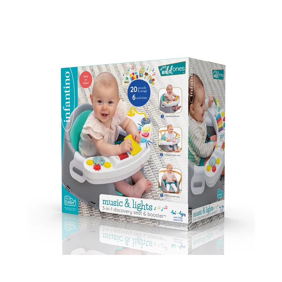 The Infantino Music and Lights 3-in-1 Discovery Seat and Booster is the ultimate multitasking essential for growing babies. It combines an engaging activity center, a convenient snack-time seat, and a booster for mealtime—all designed to support