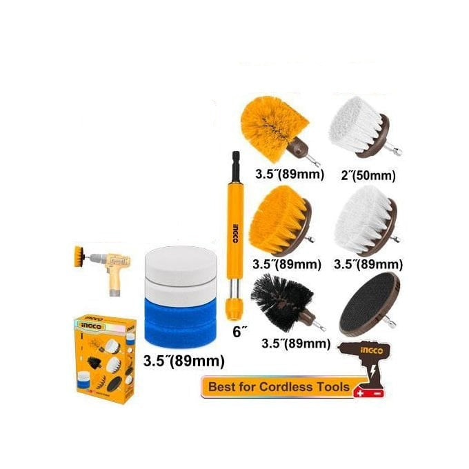 Includes a 1/4" hex shank, 1 piece 2" soft bristle brush, 1 piece 3.5" soft bristle brush, 1 piece 3.5" medium bristle brush, 1 piece 360-degree medium bristle brush, 1 piece 360-degree abrasive bristle brush, 1 piece 6" extension holder, 2 pieces 3.5" scour pads, 2 pieces 3.5" sponges, and 1 piece backer pad.