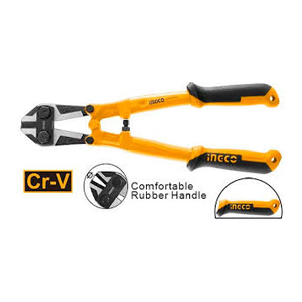 This Ingco 12-inch bolt cutter features a Cr-V (chromium-vanadium) steel blade with a black finish and polish for durability and corrosion resistance. It comes with a comfortable TPR two-color handle for improved grip and control. Ideal for cutting bolts, chains, and wire. Packed by paper card.