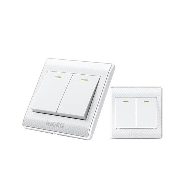 This Ingco 16A 2-gang 2-way switch measures 86mm by 86mm with an installation size of 60mm. It is rated at 16A 250V~ and designed for versatile 2-way switching applications. Packed by plastic bag.