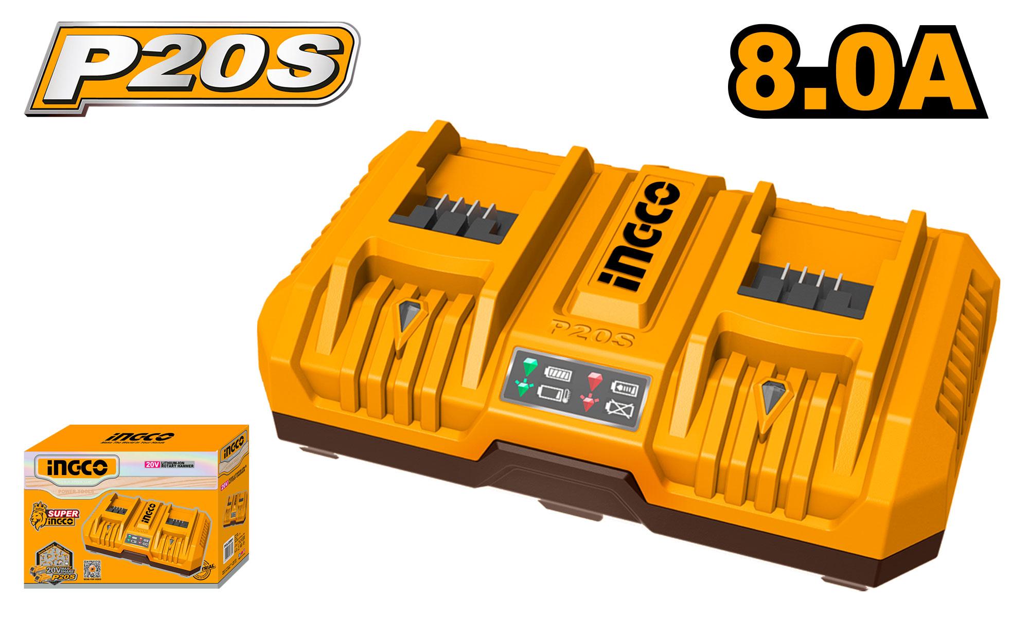 The Ingco FCLI2082 is a dual-port lithium-ion battery charger built for the P20S 20V battery series. With an input voltage of 220–240V at 50/60Hz, it provides a total output of 20V at 4A+4A, enabling efficient simultaneous charging of two batter