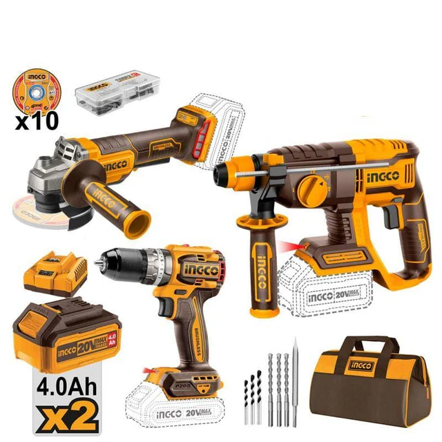 This combo kit includes a 20V lithium-ion compact brushless impact drill (CIDLI20602E), an angle grinder (CAGLI211156), and a rotary hammer (CRHLI20208). The brushless impact drill features a no-load speed of 0-550/0-2000rpm, providing efficient a