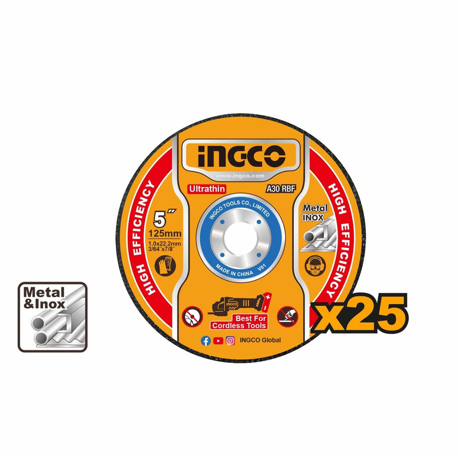The Ingco MCD1012525 is a 25-piece set of ultra-thin metal cutting discs designed for precise and efficient cutting of metal and inox materials. Each disc measures 125mm x 1.0mm x 22.2mm and features a flat center for smooth operation. With a maxi
