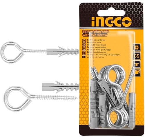 The Ingco HWSPK5022 set includes 6 screw plug sets, each consisting of a 5mm eye screw and an 8 x 40mm grey plastic screw plug. These are ideal for general-purpose fastening and come neatly packaged on a blister card for convenience and easy stora