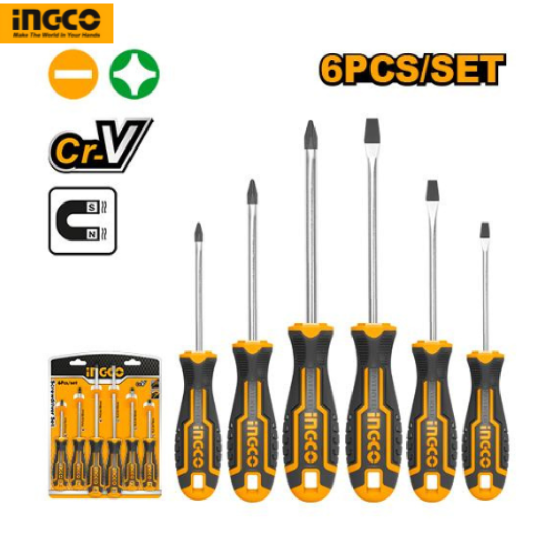 The Ingco 6 Pieces Screwdriver Set (Model: HKSD0628) is a reliable and durable toolset made from high-quality CR-V material, featuring round blades and ergonomically designed new handles for enhanced grip and comfort. It includes six screwdrivers:
