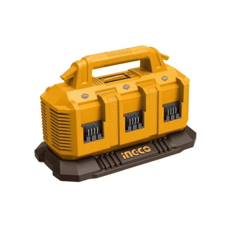 The Ingco FCLI2064 is a high-capacity 6-port lithium-ion battery charger designed to support P20S 20V battery packs. Operating with an input voltage of 220–240V at 50/60Hz, it delivers a 20V output at 4A. This charger is capable of sequentially